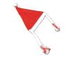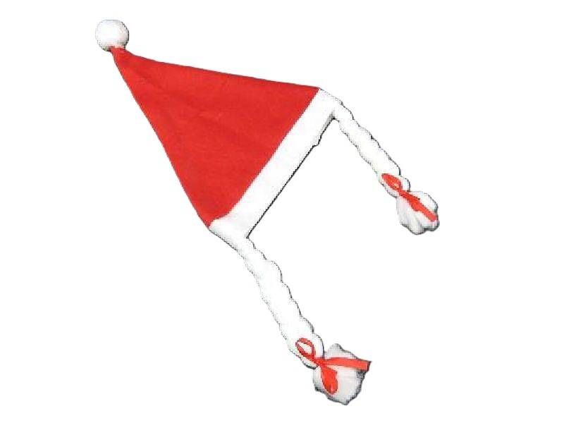 Czerwona czapka z białymi wykończeniami, pomponem i długimi warkoczami. Czapka wykonana z materiału filcowego.