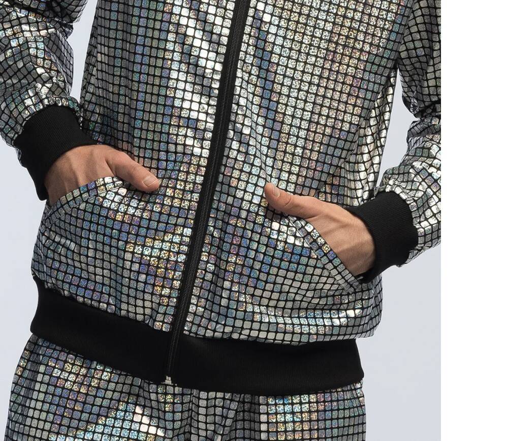 Połączenie bluzy zapinanej na zamek i pasujących do niej spodni w błyszczącym srebrnym wzorze disco sprawia,