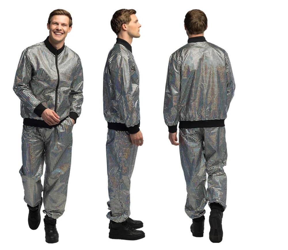 Postaw na maksimum efektu w tym srebrnym dresie disco dla mężczyzn w rozmiarze L.