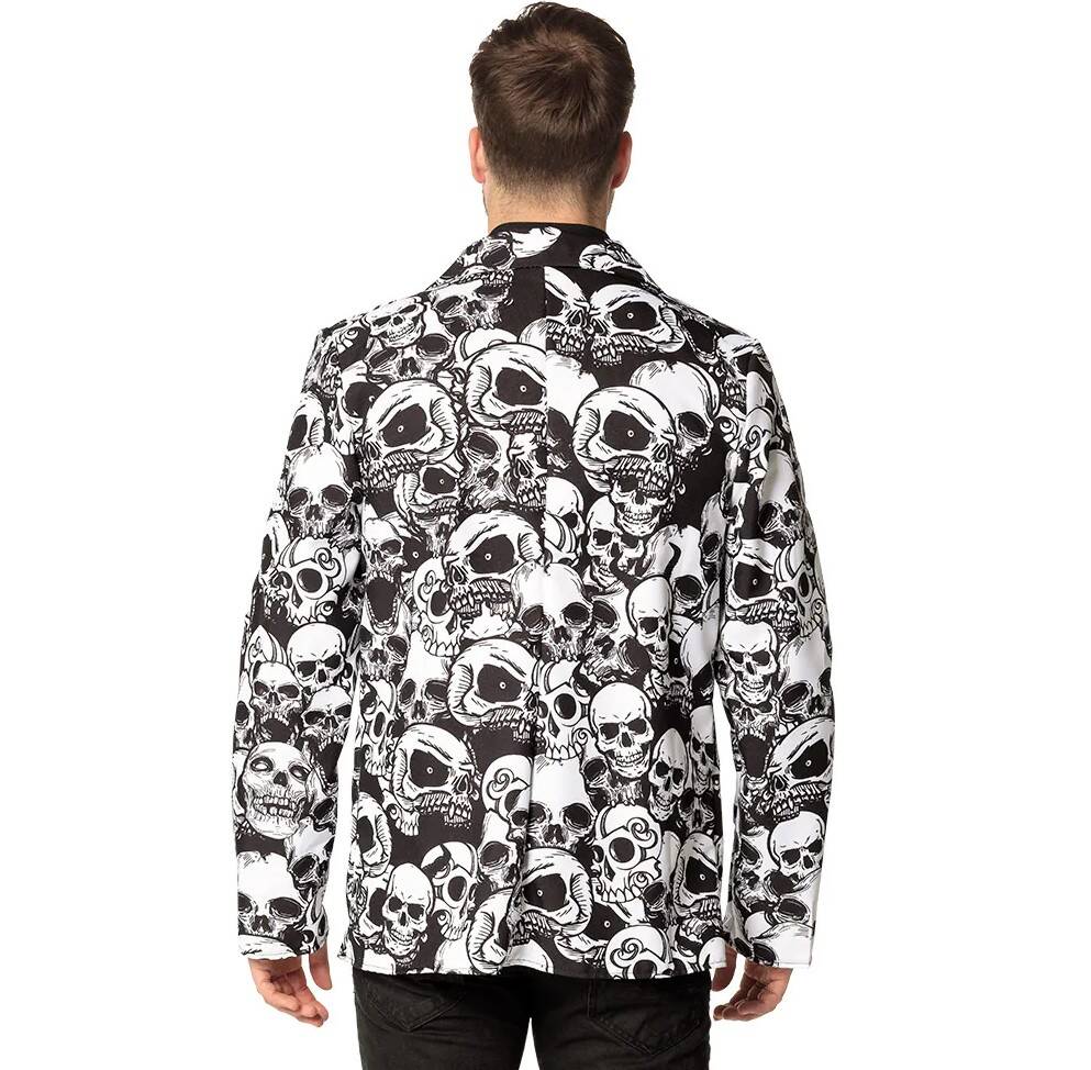 Motyw czaszek sprawi, że marynarka doskonale oddaje halloweenowy klimat, idealnie nadając się na różnorodne okazje związane z obchodami tego święta. Jej mroczny design z pewnością przyciągnie wzrok i pozwoli wyróżnić się w tłumie, a nietuzinkowe wykończenie sprawia, że można ją nosić zarówno na imprezy tematyczne, jak i na casualowe spotkania.