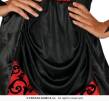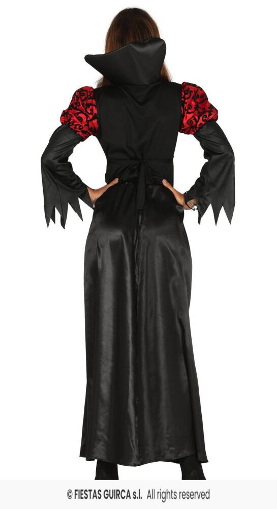 długa suknia w kolorze czarno-czerwonym, ze stojącym kołnierzem,