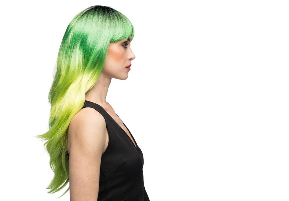 Proste, lśniące włosy mają efekt ombre w odcieniach od czerni, przez szmaragdową zieleń, po limonkową zieleń.
