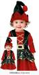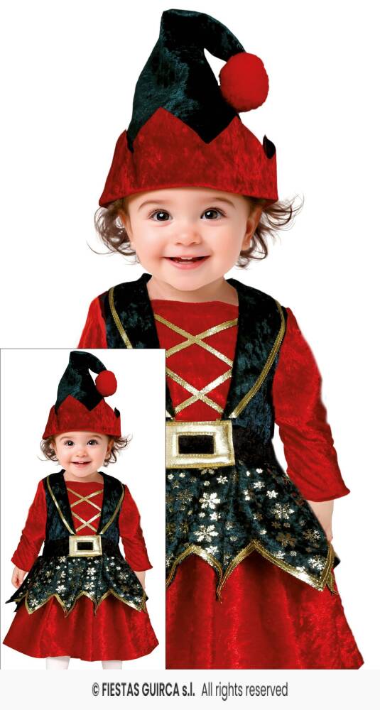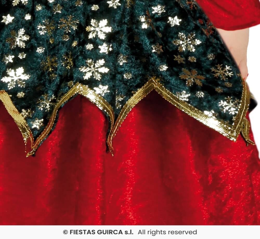 Sukienka z miękkiego materiału weluru jest w czerwonym kolorze z zieloną bastinką ozdobioną złotymi śnieżynkami, które nadają jej elfi charakter.