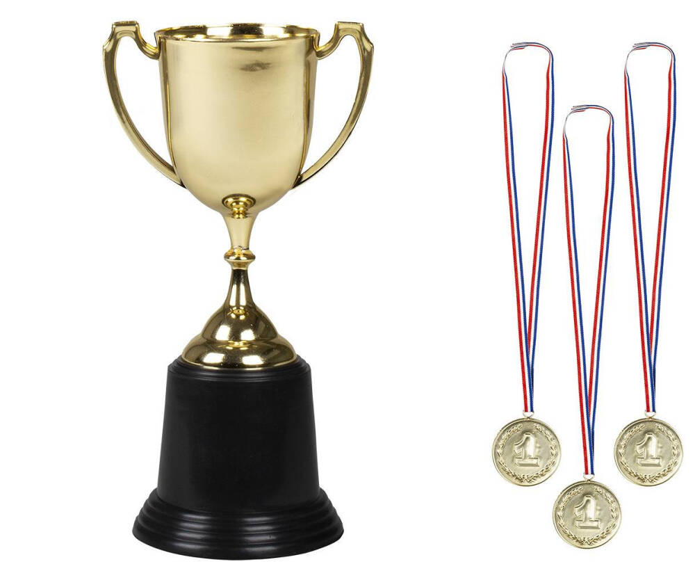 Elegancki zestaw nagród obejmuje złoty puchar o wysokości 22 cm oraz trzy medale.
